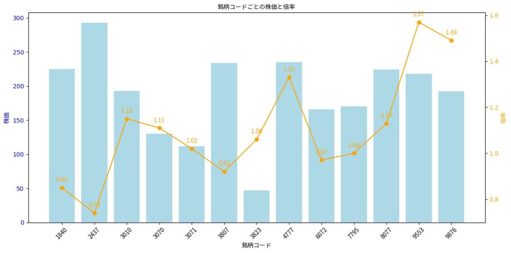 plt.title(‘銘柄コードごとの株価と倍率’, fontproperties=font_prop)