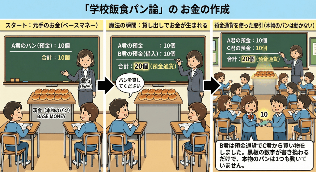 - この時点で、黒板上のパン(預金通貨)は、A君の10個+B君の10個=合計20個になりました。
